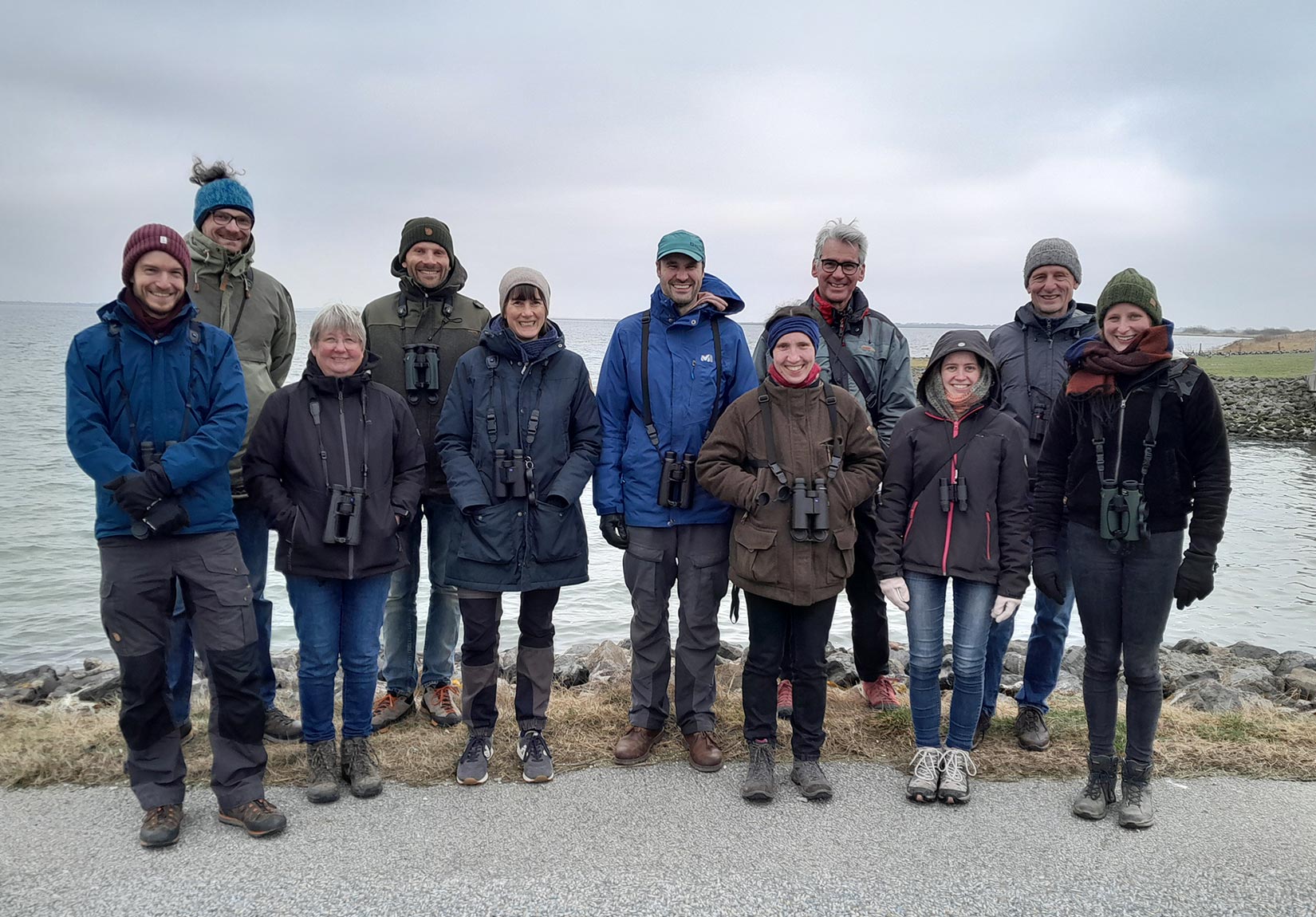 Dominic Cimiotti und Jolina Kröger stellten die Ergebnisse des wissenschaftlichen Monitorings und die Schutzmaßnahmen des MOIN im Beltringharder Koog vor. Im Anschluss schloss sich eine Exkursion ins Gebiet an. Unter der fachkundigen Leitung von Dominic, Jannik und Jolina wurden die Teilnehmenden durch das Gebiet geführt und konnten eine faszinierende Anzahl von Rast- und Brutvogelarten beobachten. Das 3.350 Hektar große Gebiet wird vom MOIN engmaschig betreut und ist in weiten Teilen durch Prädationsschutz-Maßnahmen gesichert. Dort werden vielfältige Untersuchungen durchgeführt, darunter Telemetrie an Regenpfeifern und Austernfischern. Die Größe des Gebiets, das umfassende Management und die Vielzahl an Rast- und Brutvögeln beeindruckten alle Teilnehmenden.